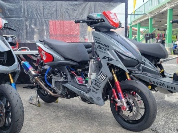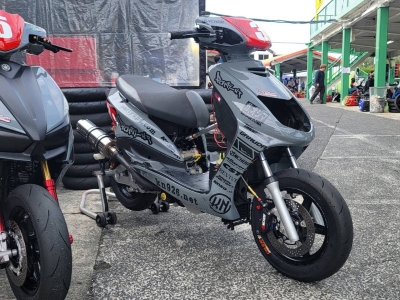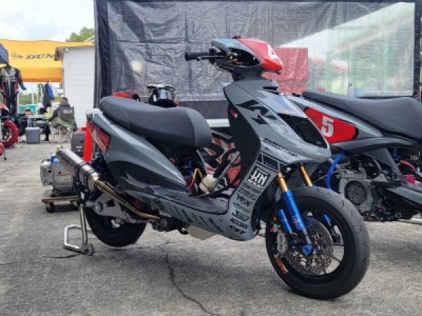西尾号!西尾選手所有の1型シグナスX。ガレージオジマチューニングの空冷DOHC63φ×ノーマルストロークの180ccです。