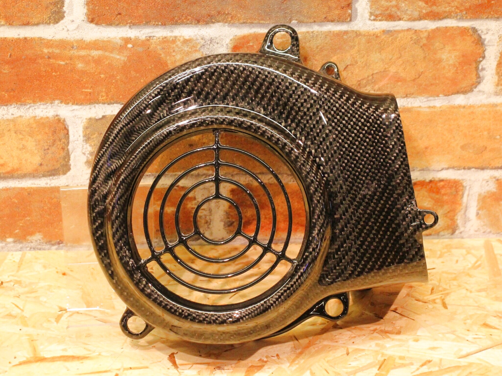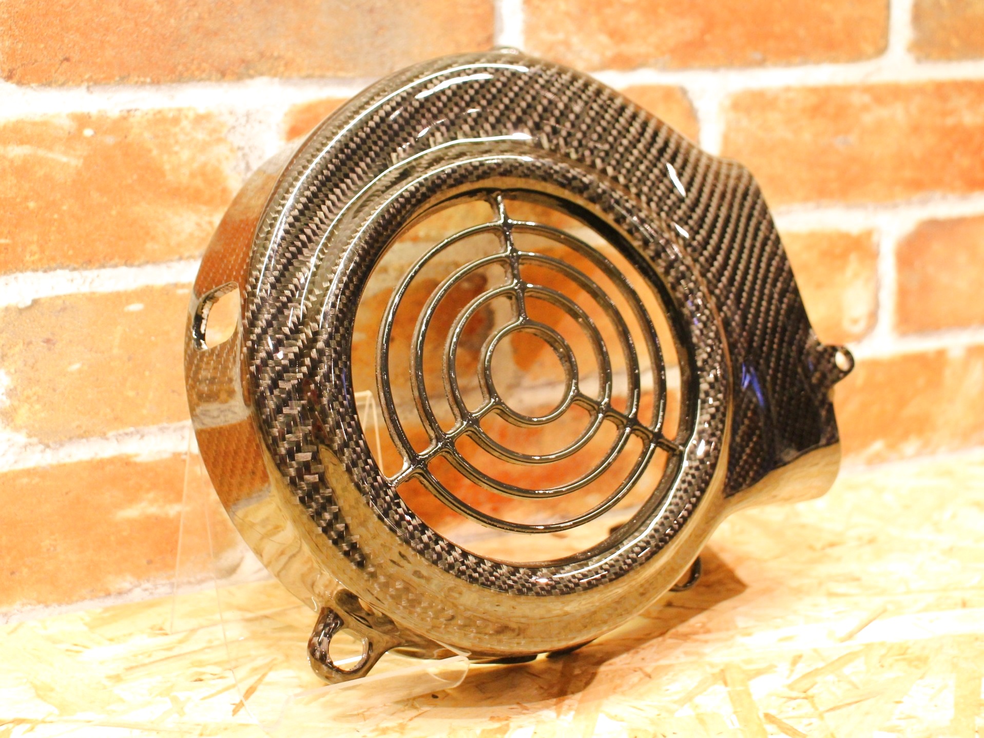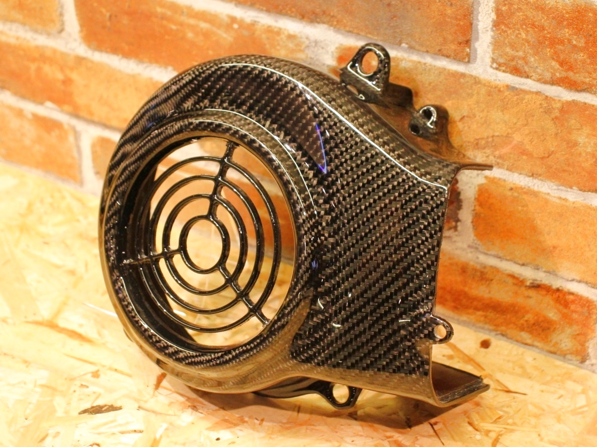 純正のファンカバーに綾織りのリアルカーボンを貼っており、強度、フィッティング共に抜群です。