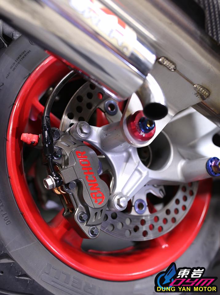 マジェスティS/SMAX/FORCE155のリアにキャリパーサポート不要で装着が可能なCNC削り出し4POTキャリパーです。